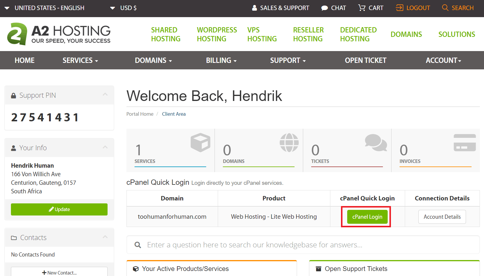 Inicie sesión en su panel de A2 Hosting. Luego, haga clic en el botón verde «Inicio de sesión en cPanel»: