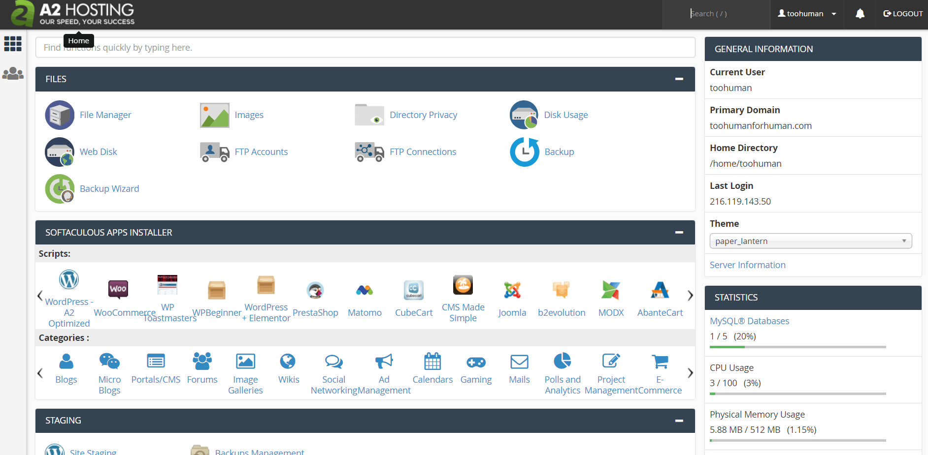Serás llevado a tu panel de control de cPanel. cPanel viene con el instalador de scripts Softaculous, que usará para instalar WordPress en su cuenta.
