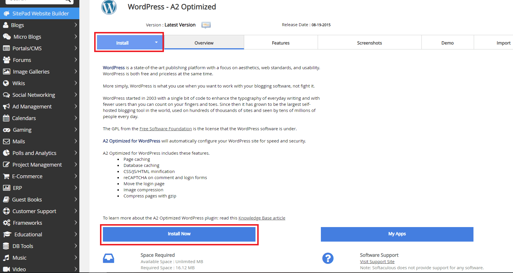Softaculous es una de las primeras secciones en cPanel, y todos los íconos son para aplicaciones que puede instalar. Como puede ver WordPress – A2 Optimized es la primera opción:
